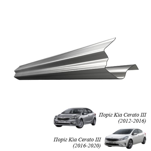 Поріг для Kia Cerato I, Kia Cerato II, Kia Cerato II Koup, Kia Cerato III, Kia Cerato IV використовується при ДТП або старінні кузова. Має запас по довжині 5 см для спрощення підгонки при установці.
